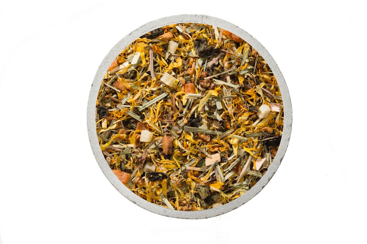 Цветочно-травяной купаж на основе ройбуша с добавлением фруктов. Рекомендуется к употреблению в вечернее время, снимает усталость и раздражение, успокаивает и расслабляет. Вкус: Средняя терпкость, умеренная кислотность, послевкусие – долгое, бархатистое, с легкой кислинкой и яркими фруктово-травяными нотами. Аромат: Многогранный, пряный, с преобладанием цветочных нот и сладких фруктовых оттенков. Цвет настоя: Золотисто-медовый, неинтенсивный, прозрачный.
