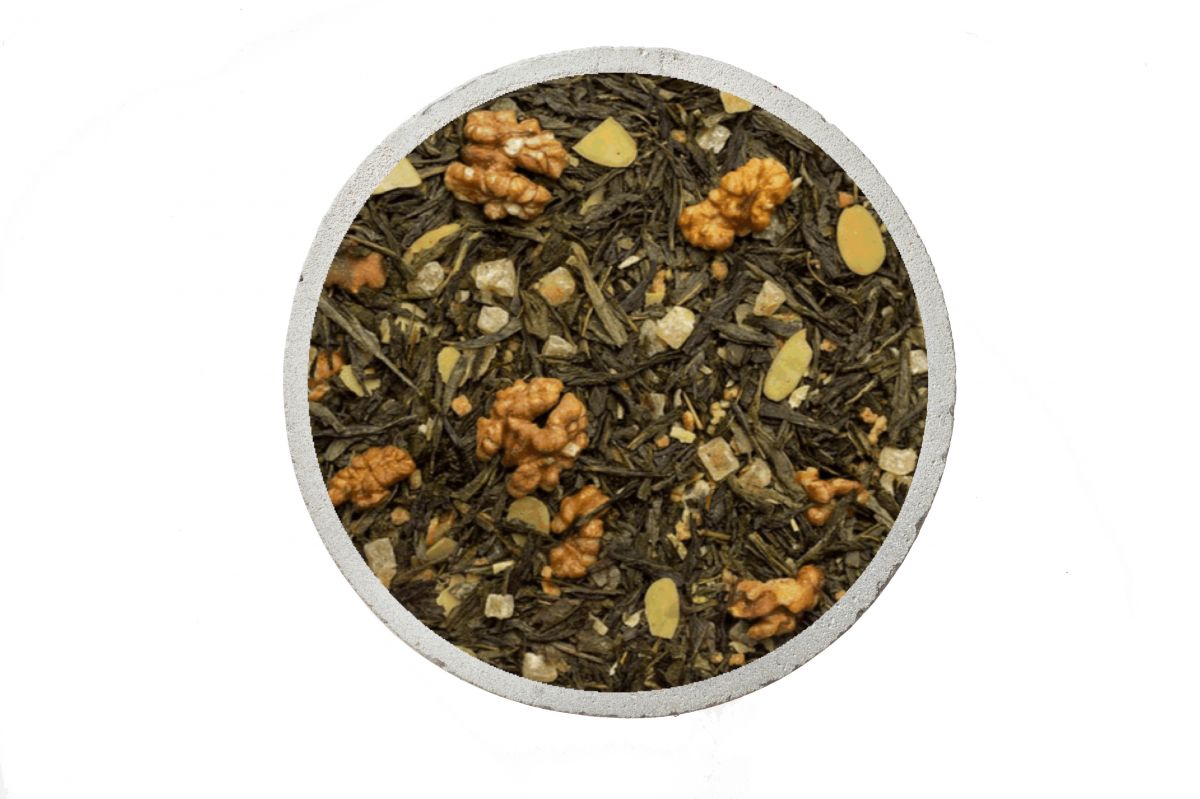 Приятная, нежная и теплая композиция из зеленого чая сенча, грецкого ореха, лепестков миндаля, воздушной крошки кокоса и тропического ананаса. Ореховые ноты сменяют себя сливочной карамелью и завершаются сладким послевкусием ананаса. Чаепитие вместе с этим чаем наполняет вечер сказками Востока с отсылками к традиционным восточным сладостям. Прекрасно сочетается с молоком, как традиционным, так и с миндальным или овсяным.