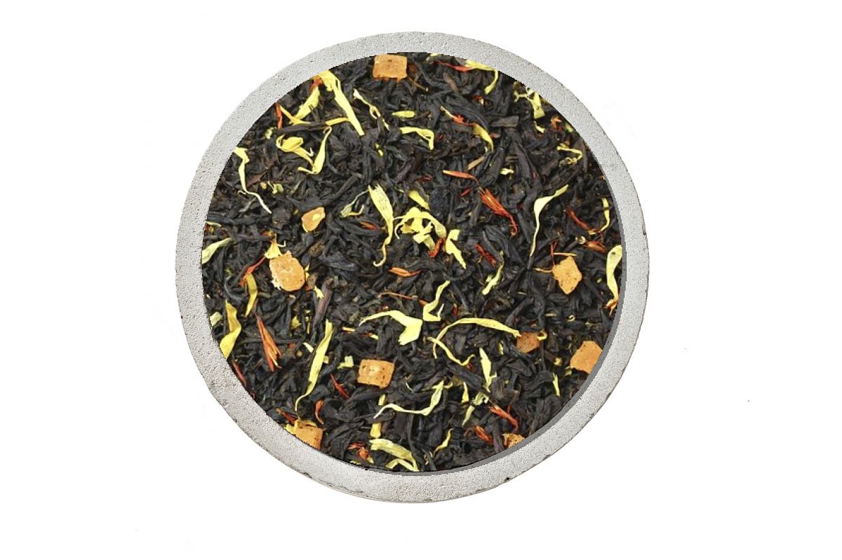 чай черный, кусочки сушеного манго, маракуйя, леестки календулы.