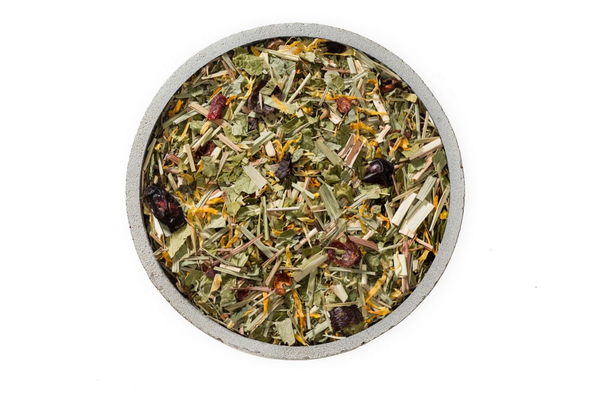 лимонная трава, мята, шиповник, лист черной смородины, ягоды барбариса, лепестки календулы, цветки лилии, смородина красная