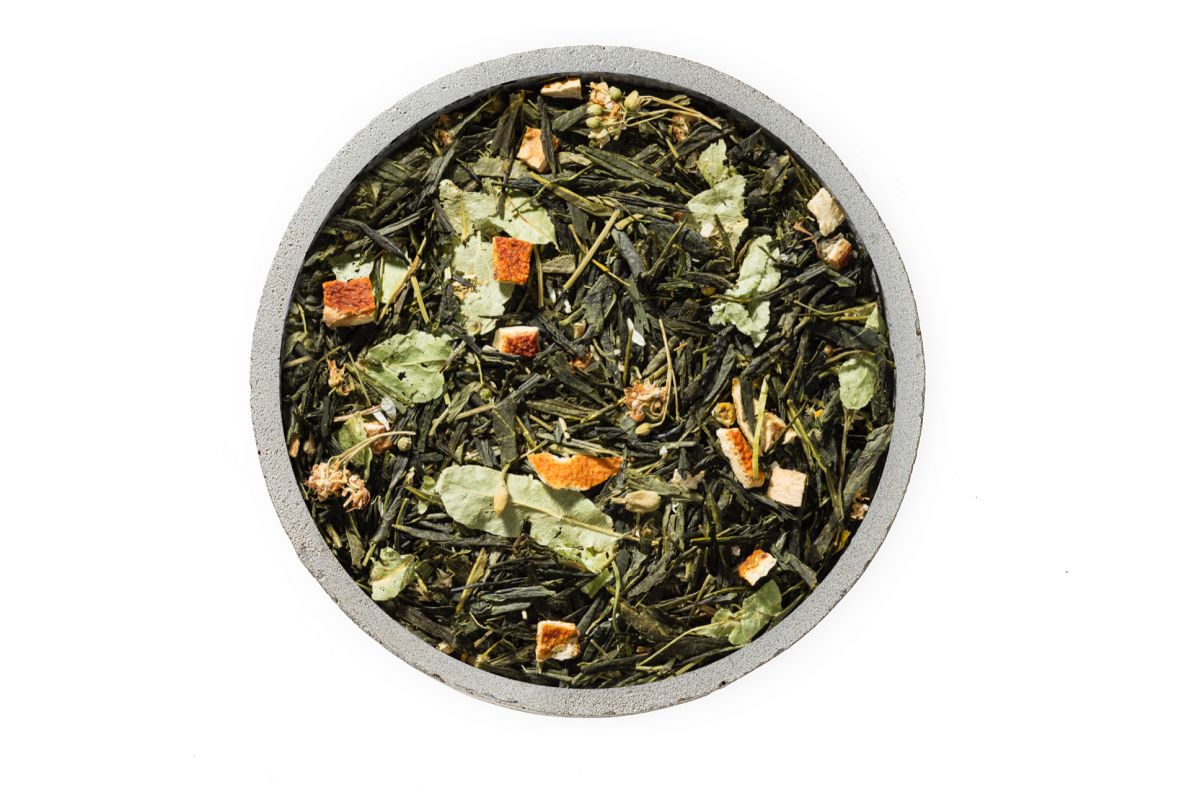 чай зеленый, цедра апельсина, липа, цветки ромашки, ароматизатор